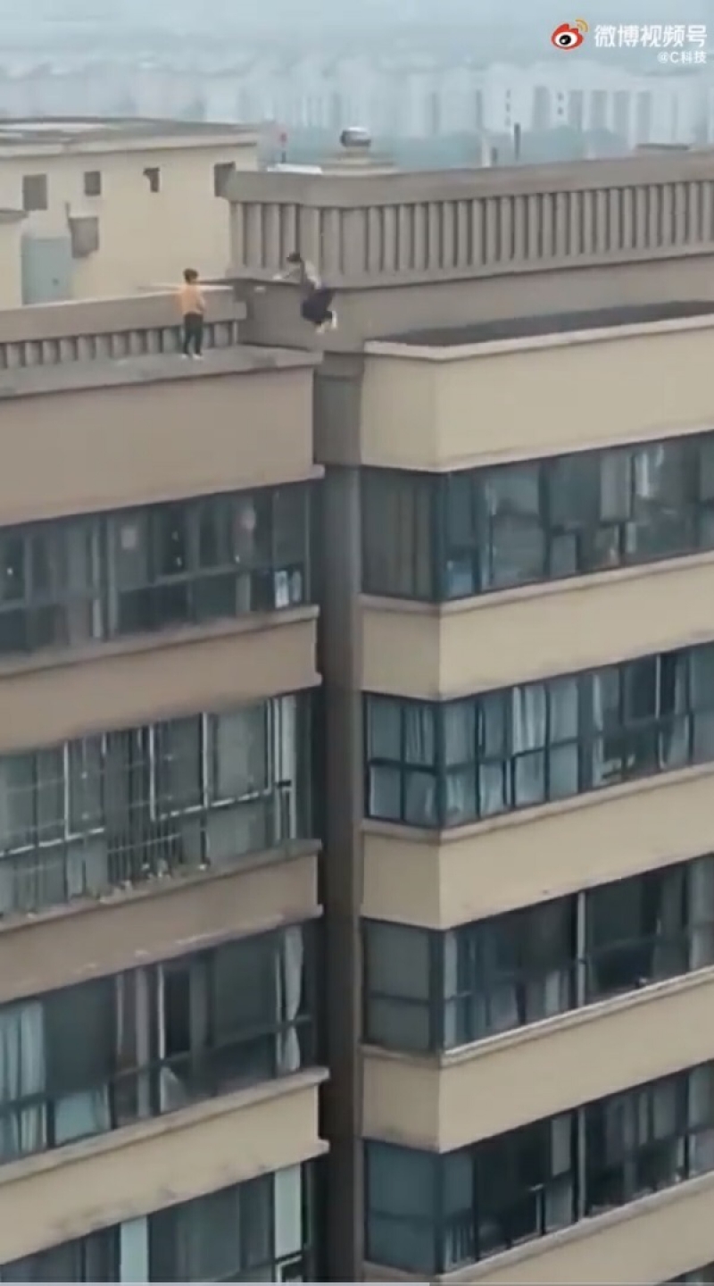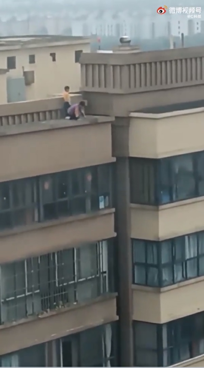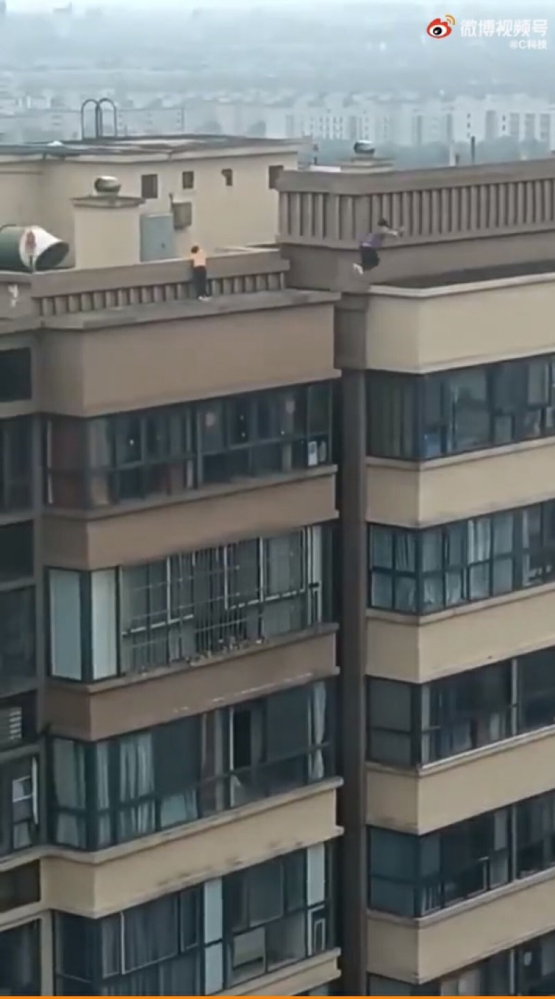 กำลังเล่นด้วยกันอย่างสนุกสนานอยู่บนดาดฟ้าของตึกสูง 27 ชั้น ในเมืองเซียนหนิง มณฑลหูเป่ย์ ประเทศจีน โดยได้เผยว่า