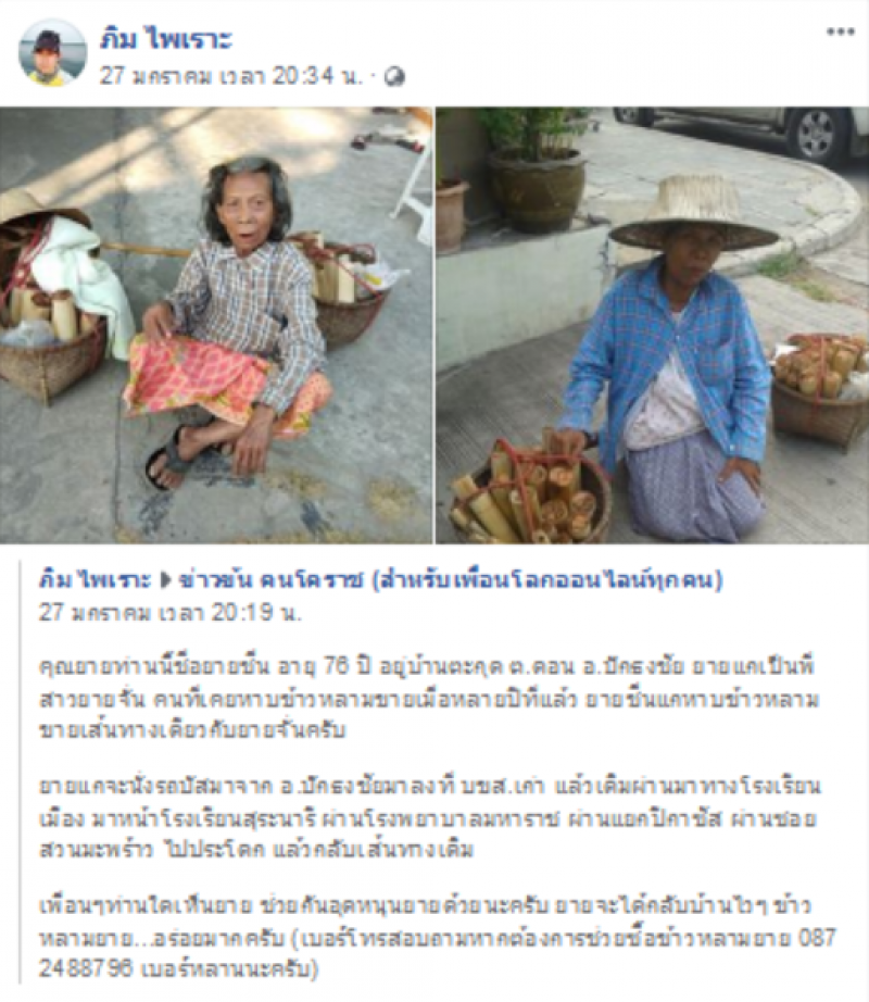 จากรณีที่ผู้ใช้เฟซบุ๊คชื่อ ภิม ไพเราะ ได้โพสต์เรื่องราวระบุว่า คุณป้าชื่น อายุ 76 ปี อยู่บ้านตะกุด ตำบลดอน อำเภอปักธงชัย จังหวัดนครราชสีมา ที่ เดินหาบข้าวหลามขายทั่วเมืองโคราช แดดร้อนแค่ไหน ก็สู้อดทน