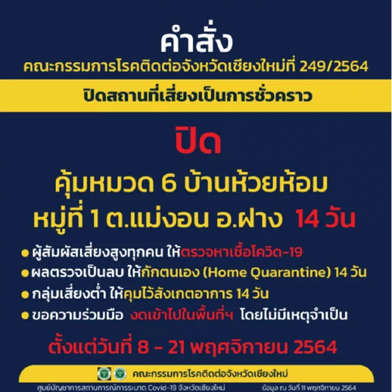 เมื่อวันที่ 10 พ.ย. 64 คณะกรรมการโรคติดต่อจังหวัดเชียงใหม่ มีมติสั่งปิด บ้านห้วยห้อม (คุ้มหมวด 6)