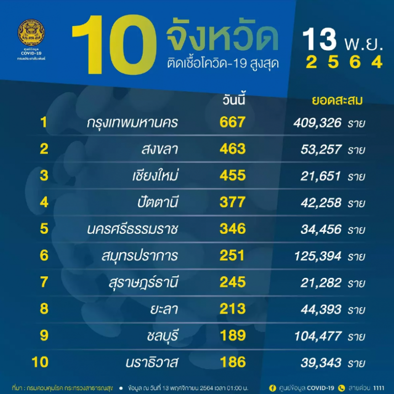 จํานวนผู้ติดcvในประเทศรายใหม่ วันที่ 13 พฤศจิกายน 2564 ตรวจสอบ 10 จังหวัดอันดับ