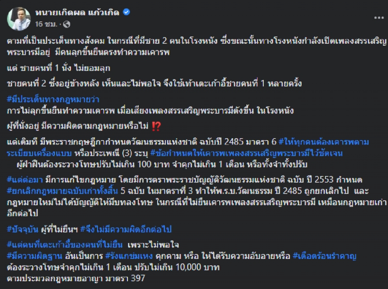 ตามที่เป็นประเด็นทางสังคมในกรณีที่มีชาย 2 คนในโรงหนัง ซึ่งขณะนั้นทางโรงหนังกำลังเปิดเพลงสรรเสริญพระบารมีอยู่ มีคนลุกขึ้นยืนตรงทำความเคารพ แต่ ชายคนที่ 1 นั่ง ไม่ยอมลุก ชายคนที่ 2 ซึ่งอยู่ข้างหลัง เห็นและไม่พอใจ จึงใช้เท้าเตะเก้าอี้ชายคนที่ 1 หลายครั้ง