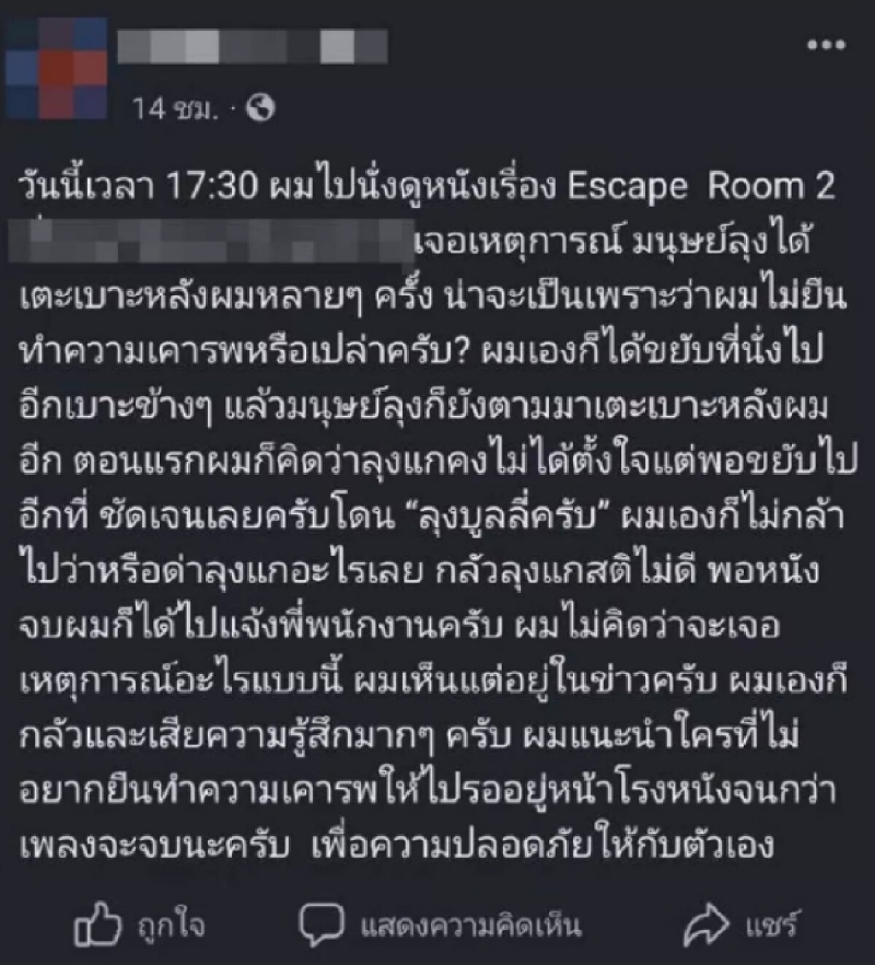 จากกรณีเหตุการณ์ผู้ใช้เฟซบุ๊ก รายหนึ่ง หลังออกมาโพสต์เล่าประสบการณ์ดูหนังในโรงไม่เป็นสุขถูกชายสูงอายุ ที่นั่งอยู่แถวหลัง