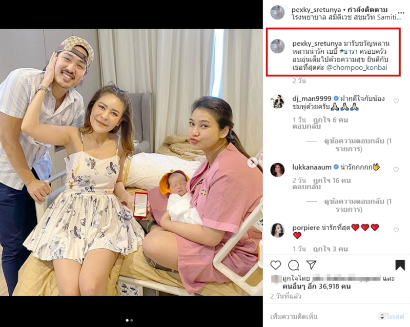 เเละล่าสุดเพื่อนสนิท สาวเป๊กกี้ ศรีธัญญา นั้นก็ได้เดินทางมารับขวัญ น้องธารา ลูกชาย ชมพู่ ก่อนบ่าย ที่โรงพยาบาล โดยเธอนั้นได้มอบสร้อยข้อมือทองคำ ให้กับหลานชายอีกด้วย โดยได้ระบุข้อความว่า