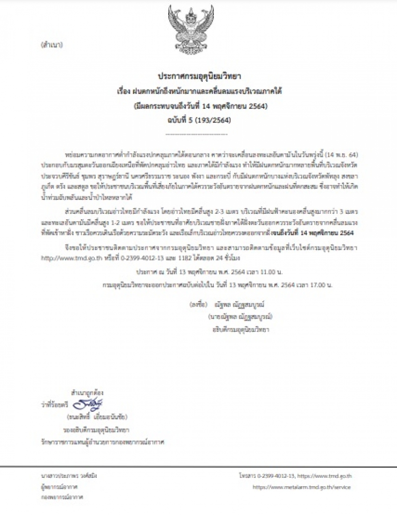 กรมอุตุนิยมวิทยา ประกาศฉบับที่ 5 ลงวันที่ 13 พฤศจิกายน 2564 ฝนตกหนักถึงหนักมากและคลื่นลมแรงบริเวณภาคใต้