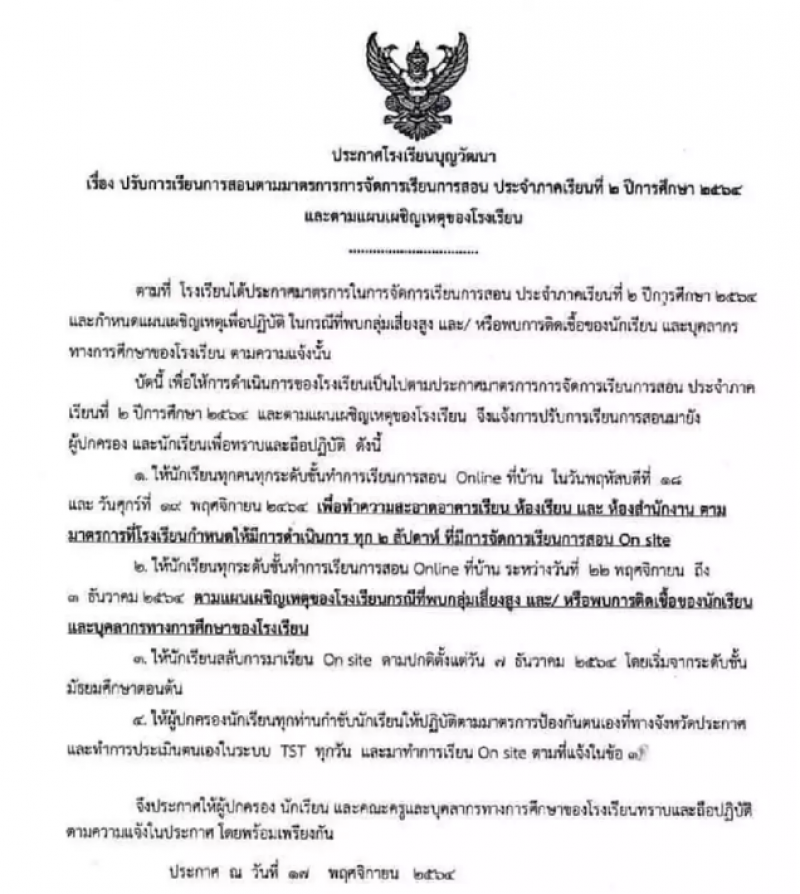 และให้กลับมาเรียนออนไลน์ในวันที่ 18-28 พ.ย. 2564 เช่นเดียวกับ โรงเรียนบุญวัฒนา จังหวัดนครราชสีมา สั่งปิดเรียนระหว่างวันที่ 18 พ.ย.-7 ธ.ค.