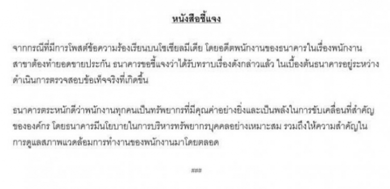 จากกรณีที่มีการโพสต์ข้อความร้องเรียนบนโซเชียลมีเดีย โดยอดีตพนักงานของธนาคารในเรื่องพนักงานสาขาต้องทำยอดขายประกัน
