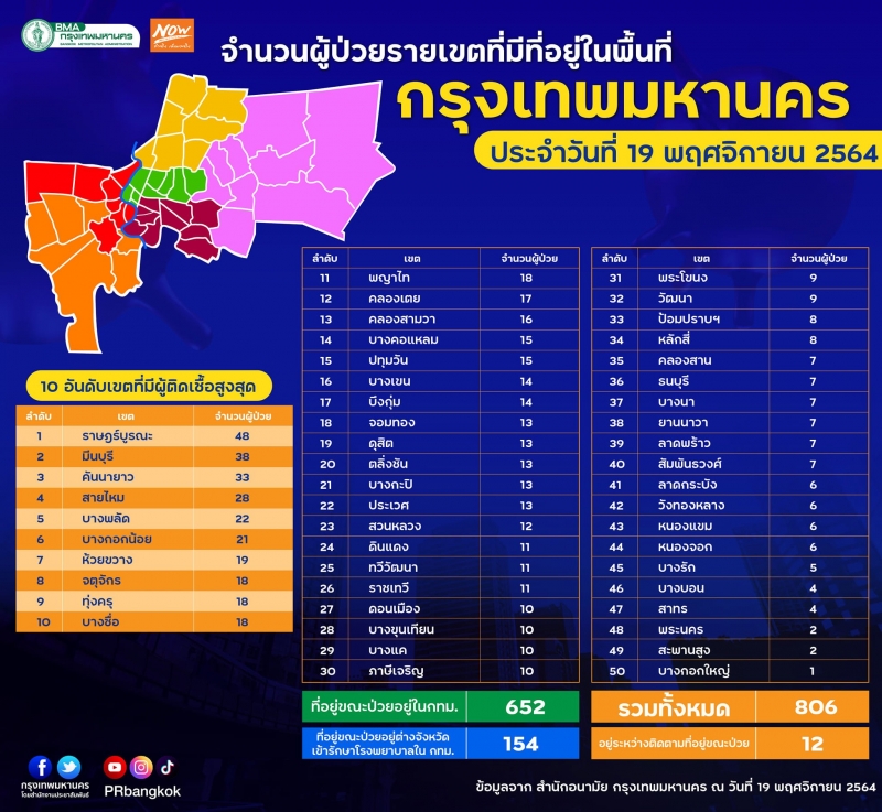 ประจำวันพฤหัสบดีที่ 19 พฤศจิกายน 2564 รวม 50 เขต ทั้งหมด 806 ราย
