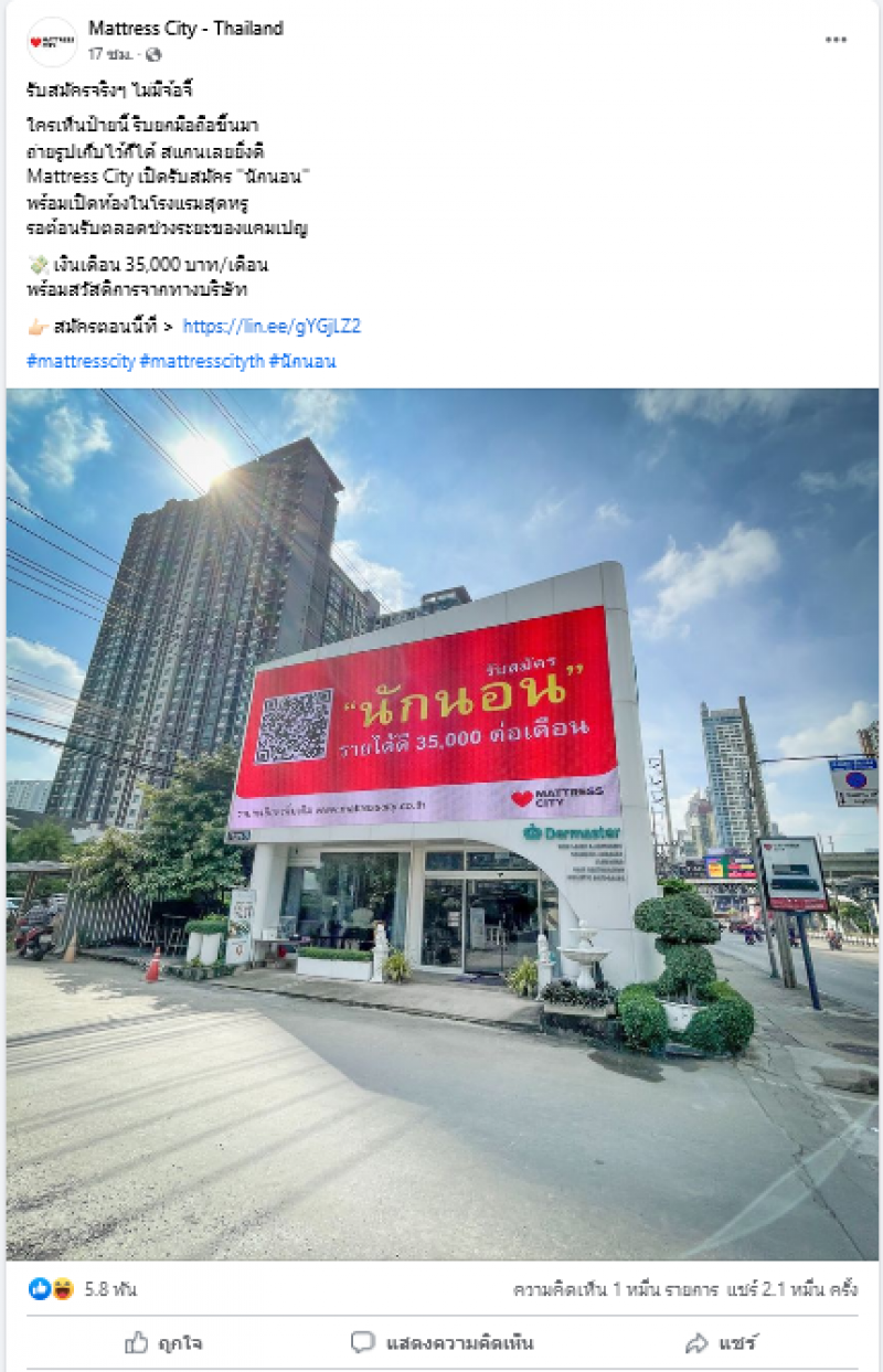 เรียกได้ว่าเป็นอาชีพในฝันของใครหลายๆคนเลยก็ว่าได้ หลังเพจ Mattress City - Thailand ได้ออกมาประกาศรับสมัคร อาชีพสุดแปลก แค่นอน รับไปเลยเงินเดือน 35,000 ทั้งนี้เพจดังกล่าวยังได้ระบุข้อความว่า