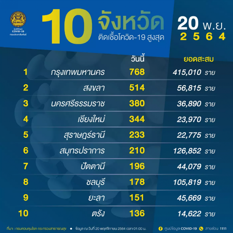 จํานวนผู้ติดCVในประเทศรายใหม่ วันที่ 20 พฤศจิกายน 2564 ตรวจสอบ 10 จังหวัดอันดับ