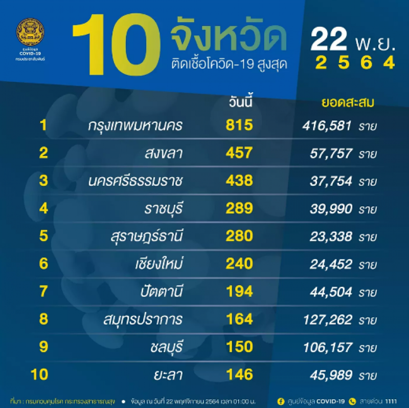 จํานวนผู้ติดในประเทศรายใหม่ วันที่ 22 พฤศจิกายน 2564 ตรวจสอบ 10 จังหวัดอันดับ