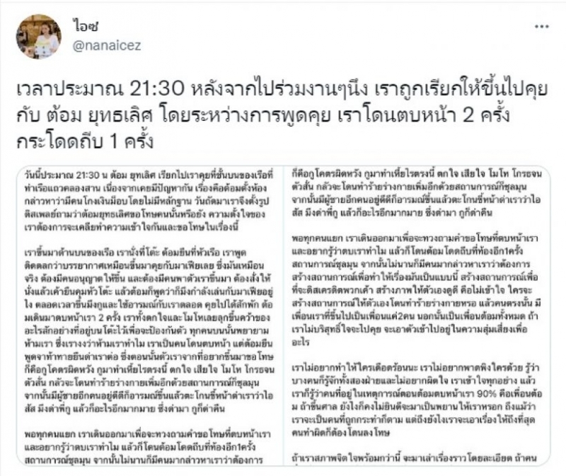 จึงมองว่าเทียบกับการที่ตนเองถูกทำไม่ได้ ซึ่งวันนั้นตนไปในฐานะผู้ร่วมงานคนหนึ่ง และ1ในผู้จัดงานเชิญให้ขึ้นไปกินข้าวบนเรือ