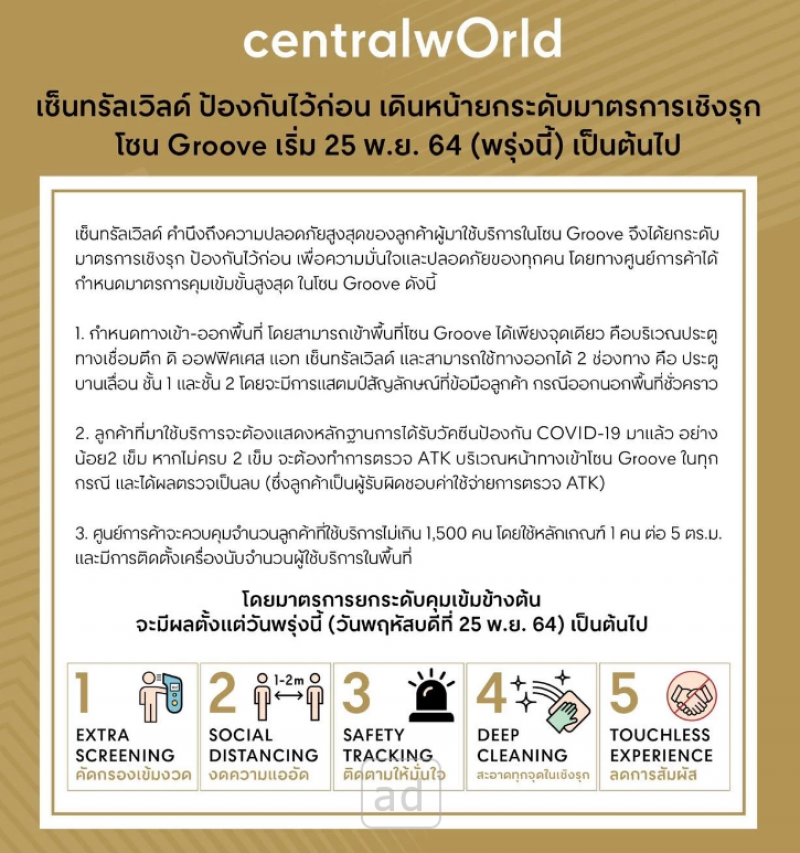 ศูนย์การค้าเซ็นทรัลเวิลด์ คำนึงถึงความปลอดภัยสูงสุดของลูกค้าผู้มาใช้บริการในโซน Groove จึงได้ยกระดับมาตรการเชิงรุก ป้องกันไว้ก่อน เพื่อความมั่นใจและปลอดภัยของทุกคน