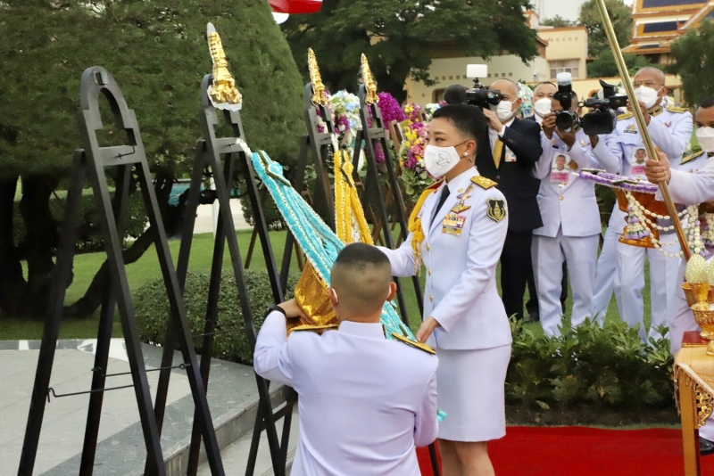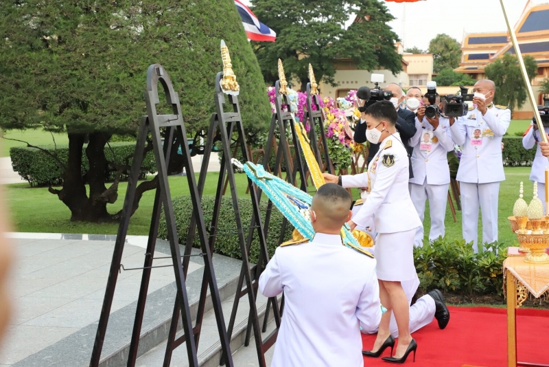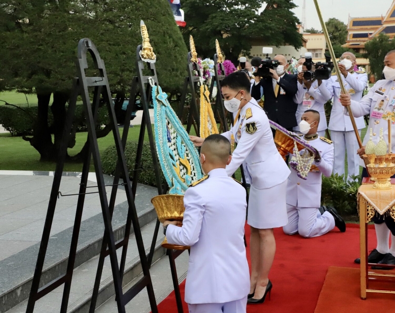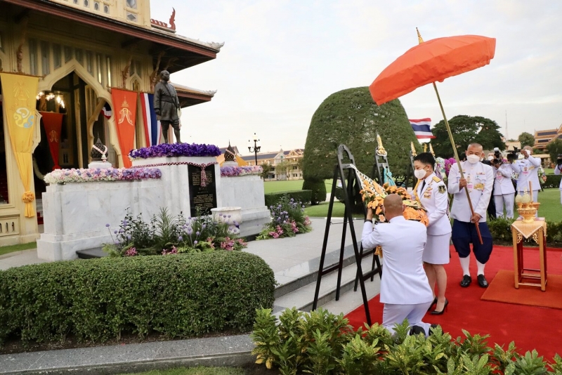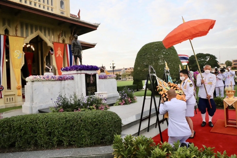 และพวงมาลาส่วนพระองค์ แล้วทรงจุดธูปเทียนเครื่องทองน้อยถวายราชสักการะพระบรมราชานุสาวรีย์ฯ ทรงกราบ