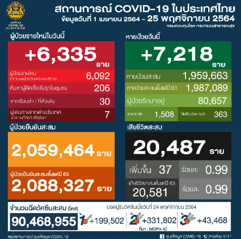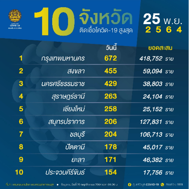 จํานวนผู้ติดCVในประเทศรายใหม่ วันที่ 25 พฤศจิกายน 2564 ตรวจสอบ 10 จังหวัดอันดับ