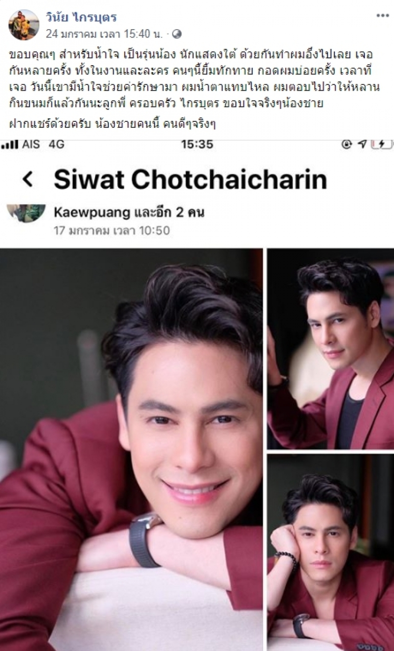 ล่าสุดทางด้าน เมฆ วินัย ได้ออกมาโพสต์ข้อความหลังพิธีกรดัง ซี ศิวัฒน์ โชติชัยชรินทร์ ได้ยื่นมือเข้าช่วยเหลือ โดยไม่ได้ประกาศออกสื่อแต่อย่างใด ซึ่งงานนี้ทางด้าน เมฆ วินัย ได้ออกมาเปิดเผยว่า ขอบคุณๆ สำหรับน้ำใจ เป็นรุ่นน้อง นักแสดงใต้ ด้วยกันทำผมอึ่งไปเลย เจอกันหลายครั้ง ทั้งในงานและละคร คนๆนี้ยิ้มทักทาย กอดผมบ่อยครั้ง เวลาที่เจอ วันนี้เขามีน้ำใจช่วยค่ารักษามา ผมนํ้าตาแทบไหล ผมตอบไปว่าให้หลานกินขนมก็แล้วกันนะลูกพี่ ครอบครัว ไกรบุตร ขอบใจจริงๆน้องชาย