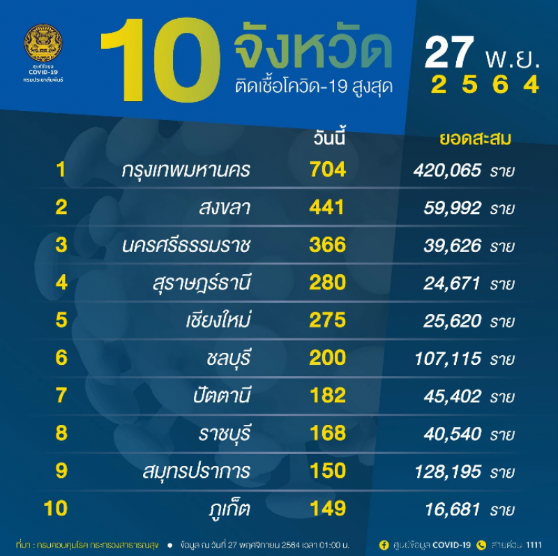 จํานวนผู้ติดcvในประเทศรายใหม่ วันที่ 27 พฤศจิกายน 2564 ตรวจสอบ 10 จังหวัดอันดับ