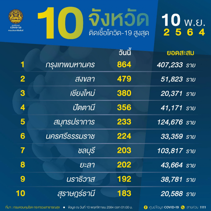 จํานวนผู้ติดcvในประเทศรายใหม่ วันที่ 10 พฤศจิกายน 2564 ตรวจสอบ 10 จังหวัดอันดับ