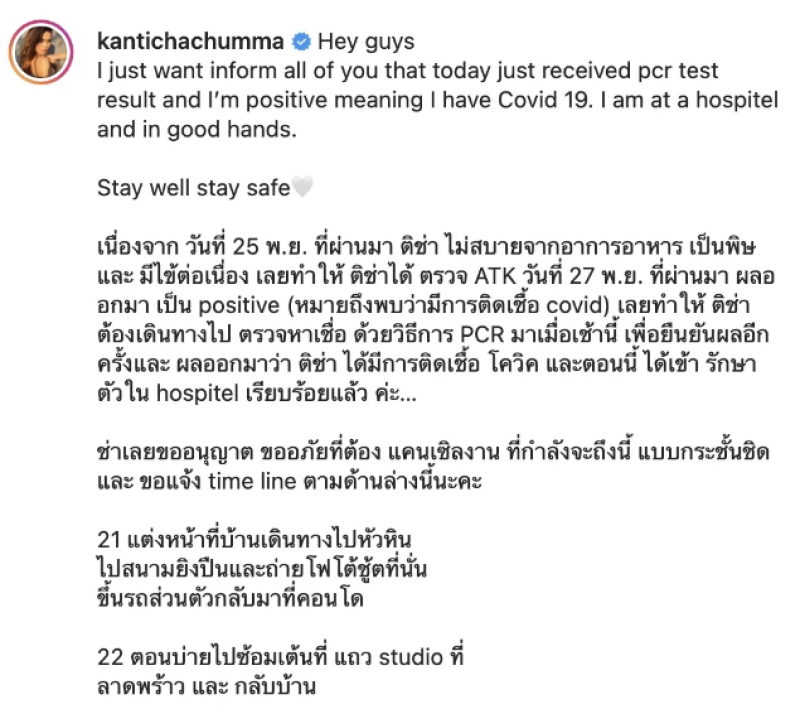 เมื่อวานนี้ 28 พ.ย. 64 ติช่า กันติชา ชุมมะ หรือ ติช่า เดอะเฟซ นักแสดงและนางแบบ ประกาศผ่านทางอินสตาแกรมของเจ้าตัวว่าติดcv พร้อมแจ้งไทมไลน์ โดยได้ระบุข้อความว่า