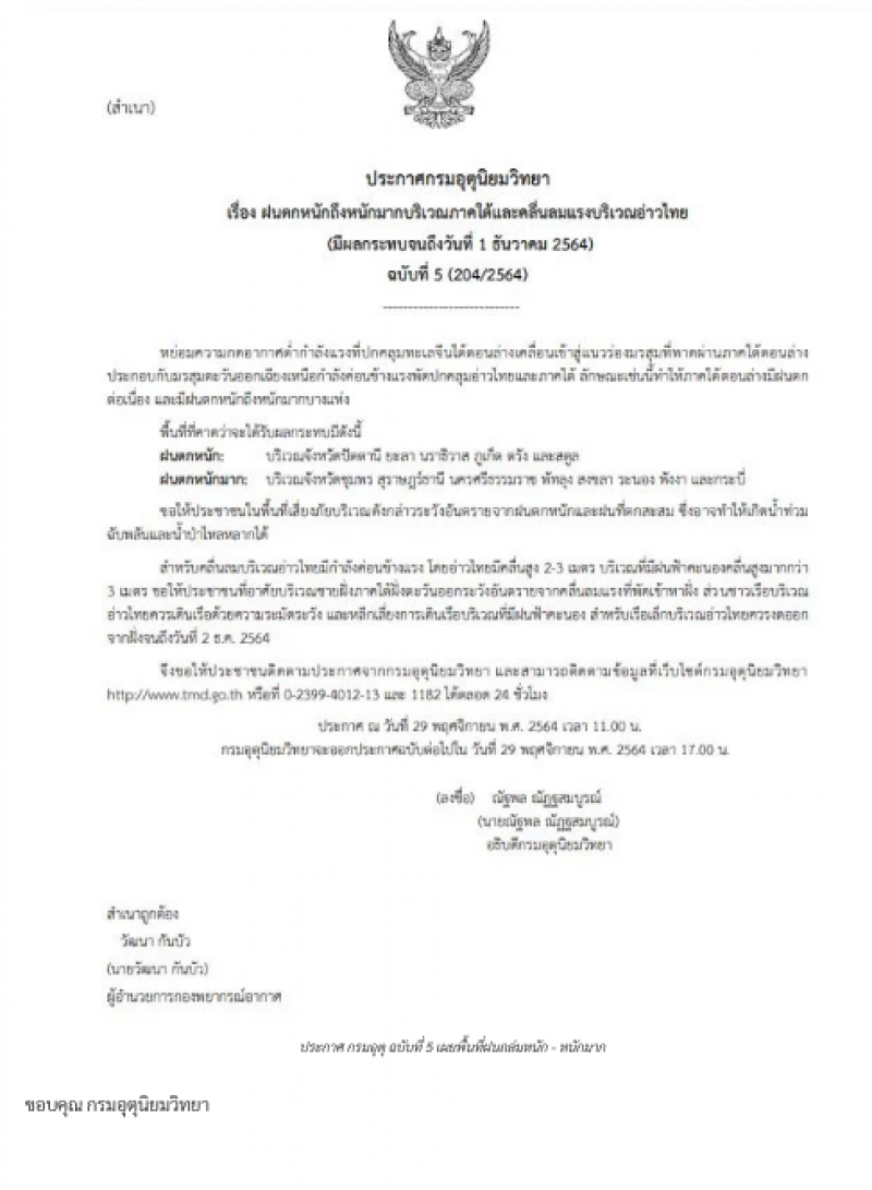 ประกาศกรมอุตุนิยมวิทยา เรื่อง ฝนตกหนักถึงหนักมากบริเวณภาคใต้และคลื่นลมแรงบริเวณอ่าวไทย (มีผลกระทบจนถึงวันที่ 1 ธันวาคม 2564) ฉบับที่ 5 ลงวันที่ 29 พฤศจิกายน 2564