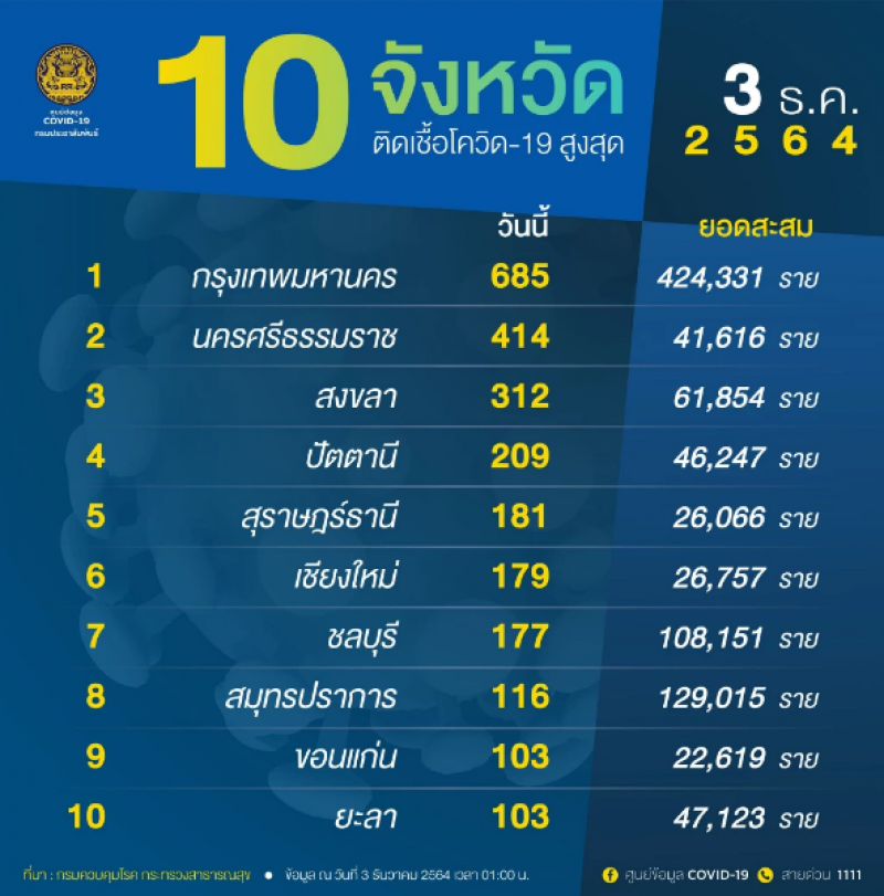 จํานวนผู้ติดcvในประเทศรายใหม่ วันที่ 3 ธันวาคม 2564 ตรวจสอบ 10 จังหวัดอันดับ