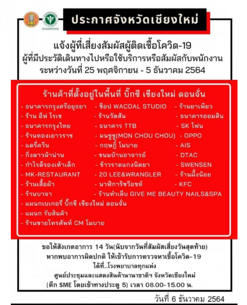 ข่าวล่าสุดนั้นทางจังหวัดเชียงใหม่ออกประกาศ แจ้งผู้ที่มีประวัติเดินทางไป หรือสัมผัสกับพนักงาน 32 ร้านเสี่ยงห้างบิ๊กซี เชียงใหม่ ดอนจั่น ระหว่างวันที่ 25 พฤศจิกายน - 5 ธันวาคม 2564 ผู้ที่มีประวัติเดินทางไปหรือใช้บริการหรือสัมผัสกับพนักงาน