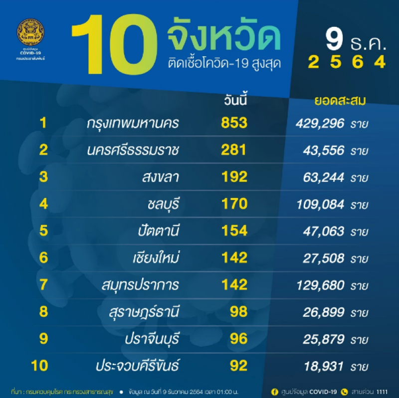 จํานวนผู้ติดcvในประเทศรายใหม่ วันที่ 9 ธันวาคม 2564 ตรวจสอบ 10 จังหวัดอันดับ