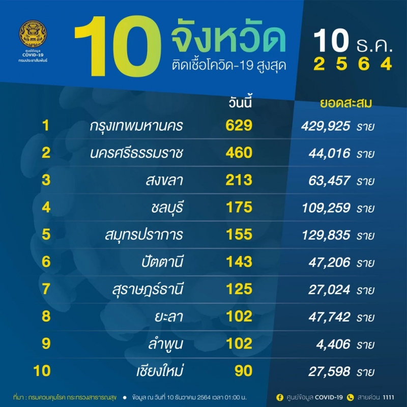 จํานวนผู้ติดcvในประเทศรายใหม่ วันที่ 10 ธันวาคม 2564 ตรวจสอบ 10 จังหวัดอันดับ