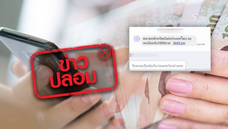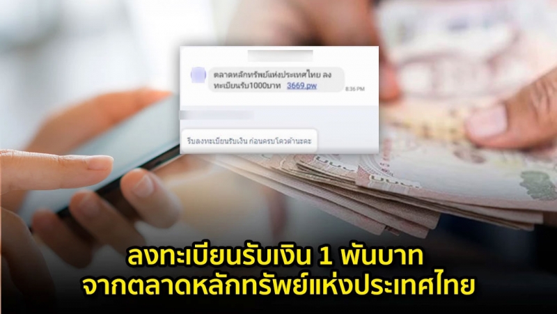 กรณีชวนเชื่อระบุว่าตลาดหลักทรัพย์แห่งประเทศไทย เปิดให้ประชาชนลงทะเบียนรับเงินฟรี 1,000 บาท ผ่าน SMS พร้อมทั้งได้ระบุลิงก์เพื่อให้กดรับสิทธิ์นั้น