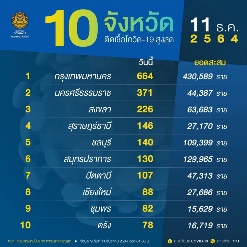 จํานวนผู้ติดcvในประเทศรายใหม่ วันที่ 11 ธันวาคม 2564 ตรวจสอบ 10 จังหวัดอันดับ
