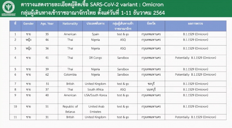 และรายที่ 11 เป็นชายชาวอังกฤษ อายุ 31 ปี เดินทางจากอังกฤษ เข้าระบบ TestGo รอผลยืนยันติดโอมิครอน