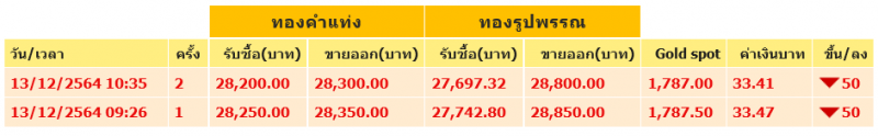 ราคาซื้อขายทองคำในประเทศชนิด 96.5% วันจันทร์ที่ 13 ธันวาคม 2564 (ประกาศครั้งที่ 2 )