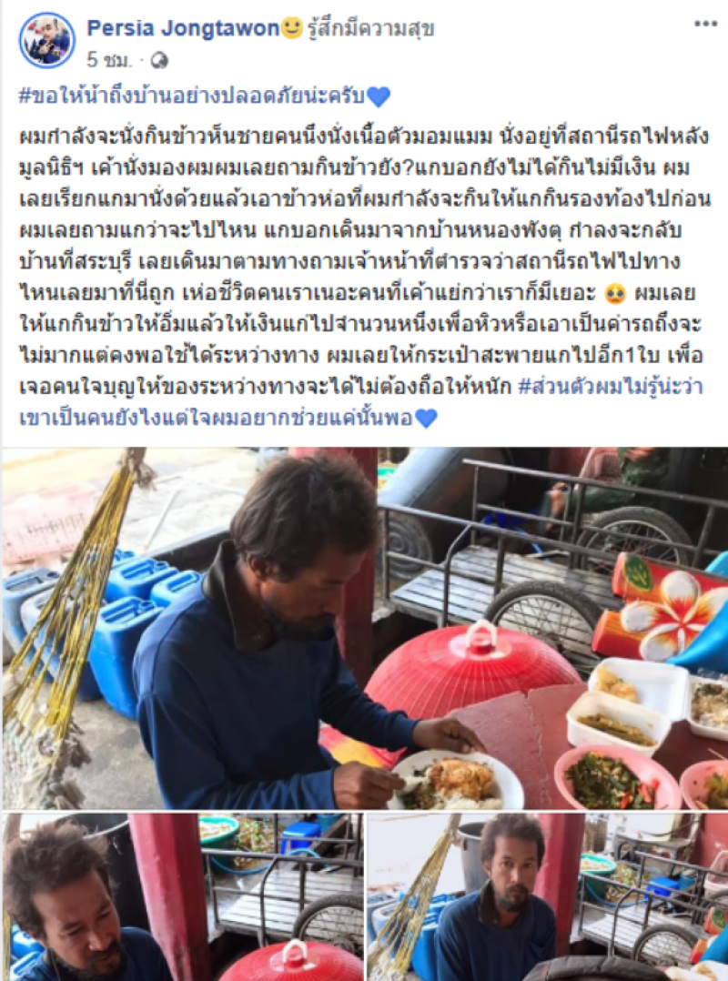 วันที่ 1 กุมภาพันธ์ 2563 ทีมงาน siamtopic ได้รับรายงานว่า โลกออนไลน์มีการกล่าวถึงและส่งต่อภาพเรื่องราวของผู้ใช้เฟซชื่อ Persia Jongtawon ซึ่งได้โพสต์ภาพของชายคนหนึ่งพร้อมระบุข้อความว่า ผมกำลังจะนั่งกินข้าวห็นชายคนนึงนั่ง ตัวมอมแมม นั่งอยู่ที่สถานีรถไฟหลังมูลนิธิฯ เค้านั่งมองผมผมเลยถามกินข้าวยัง แกบอกยังไม่ได้กินไม่มีเงิน ผมเลยเรียกแกมานั่งด้วยแล้วเอาข้าวห่อที่ผมกำลังจะกินให้แกกินรองท้องไปก่อน ผมเลยถามแกว่าจะไปไหน แกบอกเดินมาจากบ้านหนองพังตุ กำลงจะกลับบ้านที่สระบุรี เลยเดินมาตามทางถามเจ้าหน้าที่ตำรวจว่าสถานีรถไฟไปทางไหนเลยมาที่นี่ถูก เห่อชีวิตคนเราเนอะคนที่เค้าแย่กว่าเราก็มีเยอะ ผมเลยให้แกกินข้าวให้อิ่มแล้วให้เงินแก่ไปจำนวนหนึงเพื่อหิวหรือเอาเป็นค่ารถถึงจะไม่มากแต่คงพอใช้ได้ระหว่างทาง ผมเลยให้กระเป๋าสะพายแกไปอีก1ใบ เพื่อเจอคนใจบุญให้ของระหว่างทางจะได้ไม่ต้องถือให้หนัก ส่วนตัวผมไม่รู้น่ะว่าเขาเป็นคนยังไงแต่ใจผมอยากช่วยแค่นั้นพอ