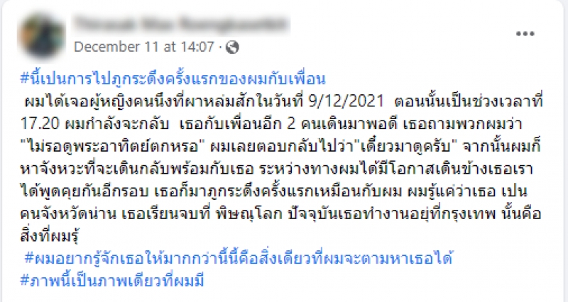 ข้อความระบุว่า นี่เป็นการไปภูกระดึงครั้งแรกของผมกับเพื่อน ผมได้เจอผู้หญิงคนนึงที่ผาหล่มสักในวันที่ 9/12/2021 ตอนนั้นเป็นช่วงเวลาที่ 17.20 ผมกำลังจะกลับ เธอกับเพื่อนอีก 2 คนเดินมาพอดี เธอถามพวกผมว่า ไม่รอดูพระอาทิตย์ตกหรอ ผมเลยตอบกลับไปว่า เดี๋ยวมาดูครับ