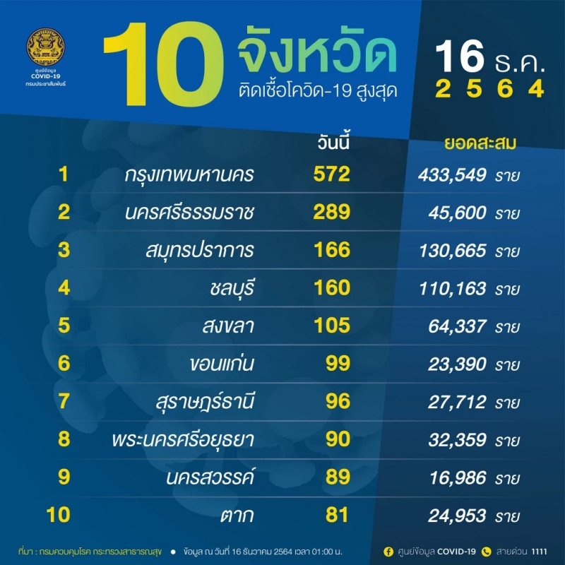 จํานวนผู้ติดcvในประเทศรายใหม่ วันที่ 16 ธันวาคม 2564 ตรวจสอบ 10 จังหวัดอันดับ