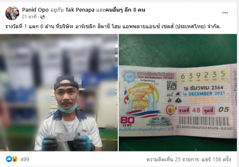 ล่าสุดมีผู้ใช้เฟสบุ๊คชื่อ Panid Opo โดยได้ออกมาโพสต์คนถูกรางวัลโดยได้ระบุข้อความว่า รางวัลที่ 1 แตก 6 ล้าน ที่บริษัท อาร์เซลิก ฮิตาชิ โฮม แอพพลายแอนซ์ เซลส์ (ประเทศไทย) จำกัด