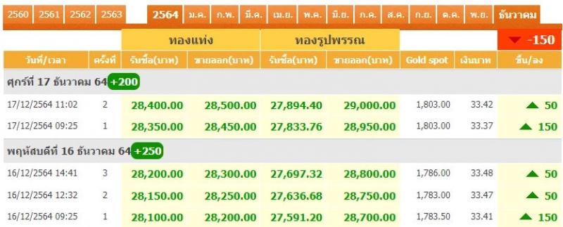 ราคาทองคําวันนี้ศุกร์ที่ 17 ธันวาคม 2564 ประกาศครั้งที่ 1 (เปิดตลาด) เมื่อเวลา 09.25 น. ปรับเพิ่มขึ้น 150 บาท และปรับรอบที่ 2 อีก 50 บาท เมื่อเทียบกับประกาศราคาซื้อขายครั้งสุดท้ายของวันพฤหัสบดี