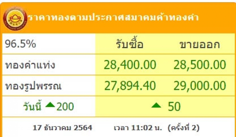 ราคาซื้อขายทองคำในประเทศชนิด 96.5% วันศุกร์ที่ 17 ธันวาคม 2564 (ประกาศครั้งที่ 2)