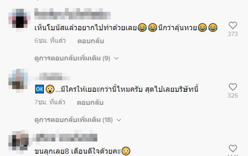 ขอบคุณผู้บริหารครับ โบนัสปี 64 8 เดือน แน่นอนว่าหลังจากคลิปนี้ได้ถูกเผยแพร่ไปก็ยังมีชาวเน็ตเข้าไปคอมเมนต์ร่วมแสดงความยินดีอีกด้วย เห็นโบนัสแล้วอยากไปทำด้วยเลย นึกว่าลุ้นหวย, มีใครให้เยอะกว่านี้ไหมครับ สุดไปเลยบริษัทนี้ และ ขนลุกเลย 8 เดือนดีใจด้วยค่ะ เป็นต้น