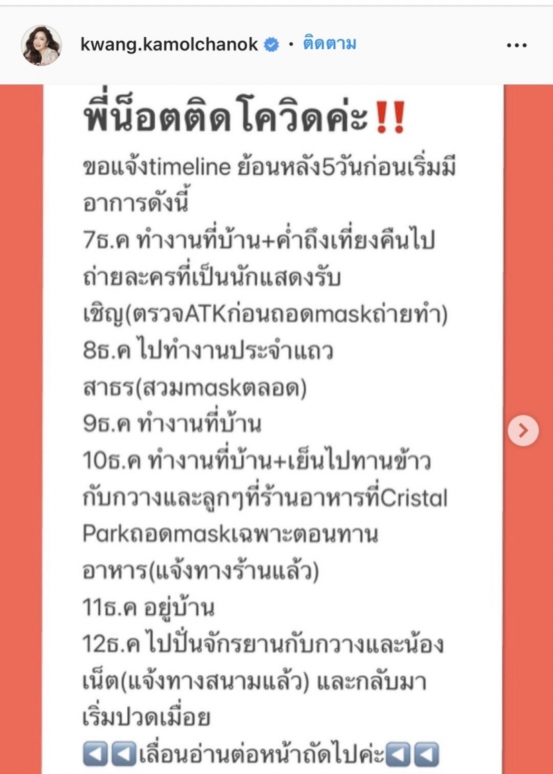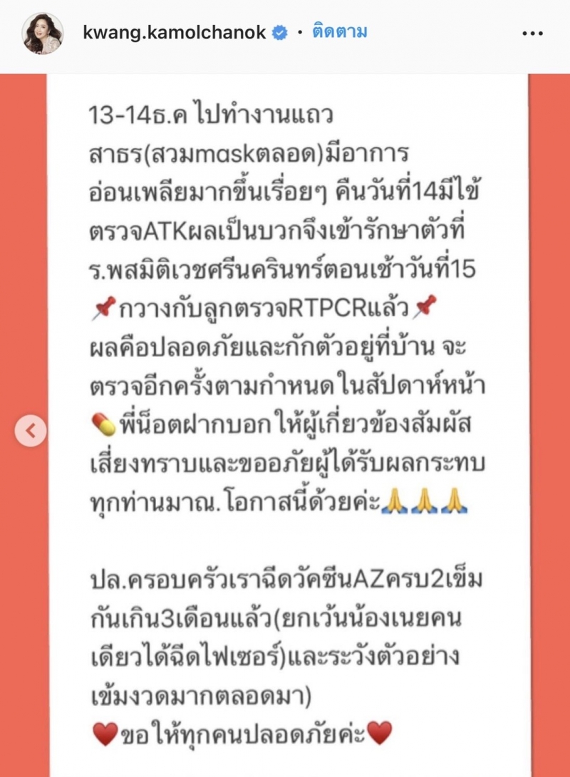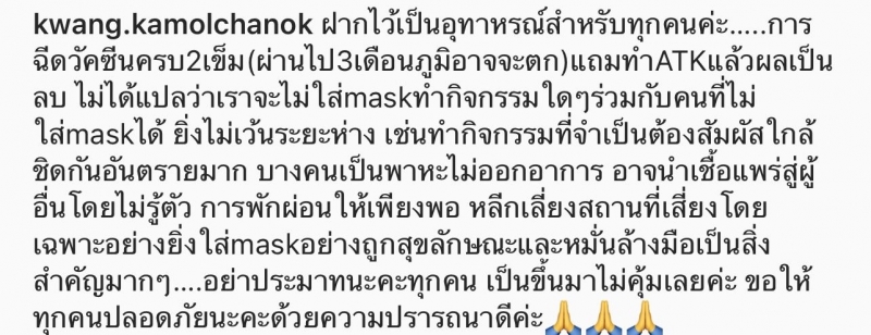 และ กวาง กมลชนก ยังได้โพสต์ข้อความเอาไว้ว่า ฝากไว้เป็นอุทาหรณ์สำหรับทุกคนค่ะ การรับวัคซีนครบ2(ผ่านไป3เดือนภูมิอาจจะตก)แถมทำATKแล้วผลเป็นลบ