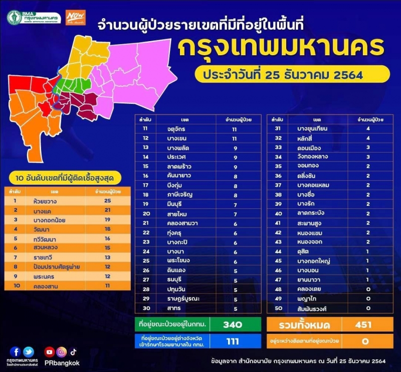 จากกรณีเพจ กรุงเทพมหานคร โดยสำนักงานประชาสัมพันธ์ เผย จำนวนผู้ติดรายเขตที่มีที่อยู่ในพื้นที่กรุงเทพฯ ประจำวันที่ 25 ธันวาคม 2564 รวม 50 เขต