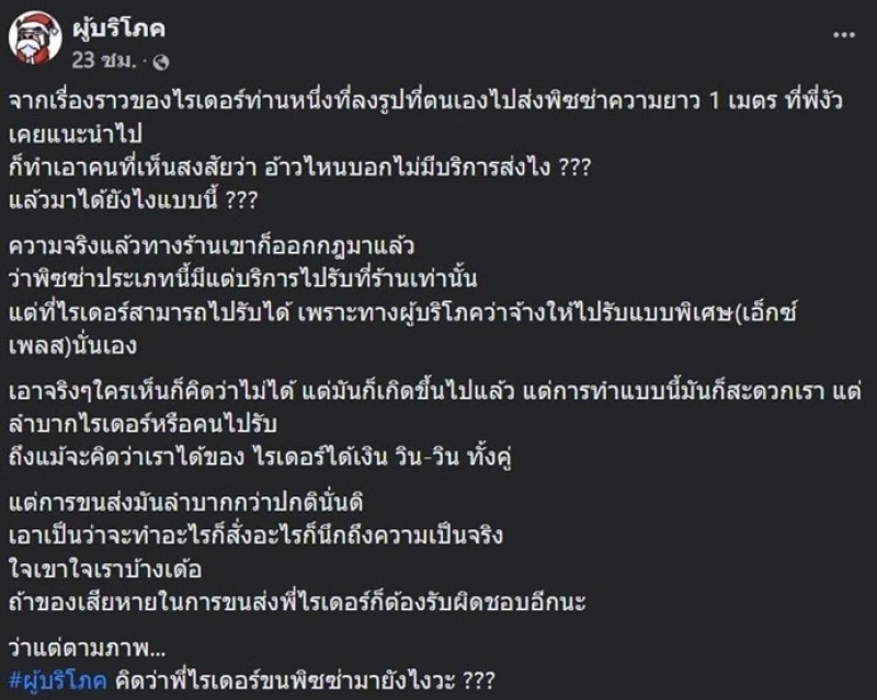 ต่อมาทางเพจ ผู้บริโภค ก็ได้โพสต์ถึงเรื่องราวดังกล่าว โดยระบุว่า จากเรื่องราวของไรเดอร์ท่านหนึ่งที่ลงรูปที่ตนเองไปส่งพิซซ่าความยาว 1 เมตร ที่พี่งัวเคยแนะนำไป ก็ทำเอาคนที่เห็นสงสัยว่า อ้าวไหนบอกไม่มีบริการส่งไง