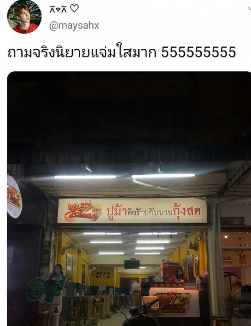 โดยผู้ใช้ทวิตเตอร์รายหนึ่งได้นำภาพหน้าร้านอาหารแห่งนี้มาโพสต์ พร้อมระบุข้อความแค่เพียงสั้นๆ ว่า ถามจริง นิยายแจ่มใสมาก 5555 ซึ่งในภาพนั้นปรากฏให้เห็นบริเวณหน้าร้านแห่งหนึ่งที่มีชื่อร้านว่า ปูม้าตัวร้าย กับ นายกุ้งสด ทำเอาชาวเน็ตอมยิ้มไปตามๆ กันเลยทีเดียว