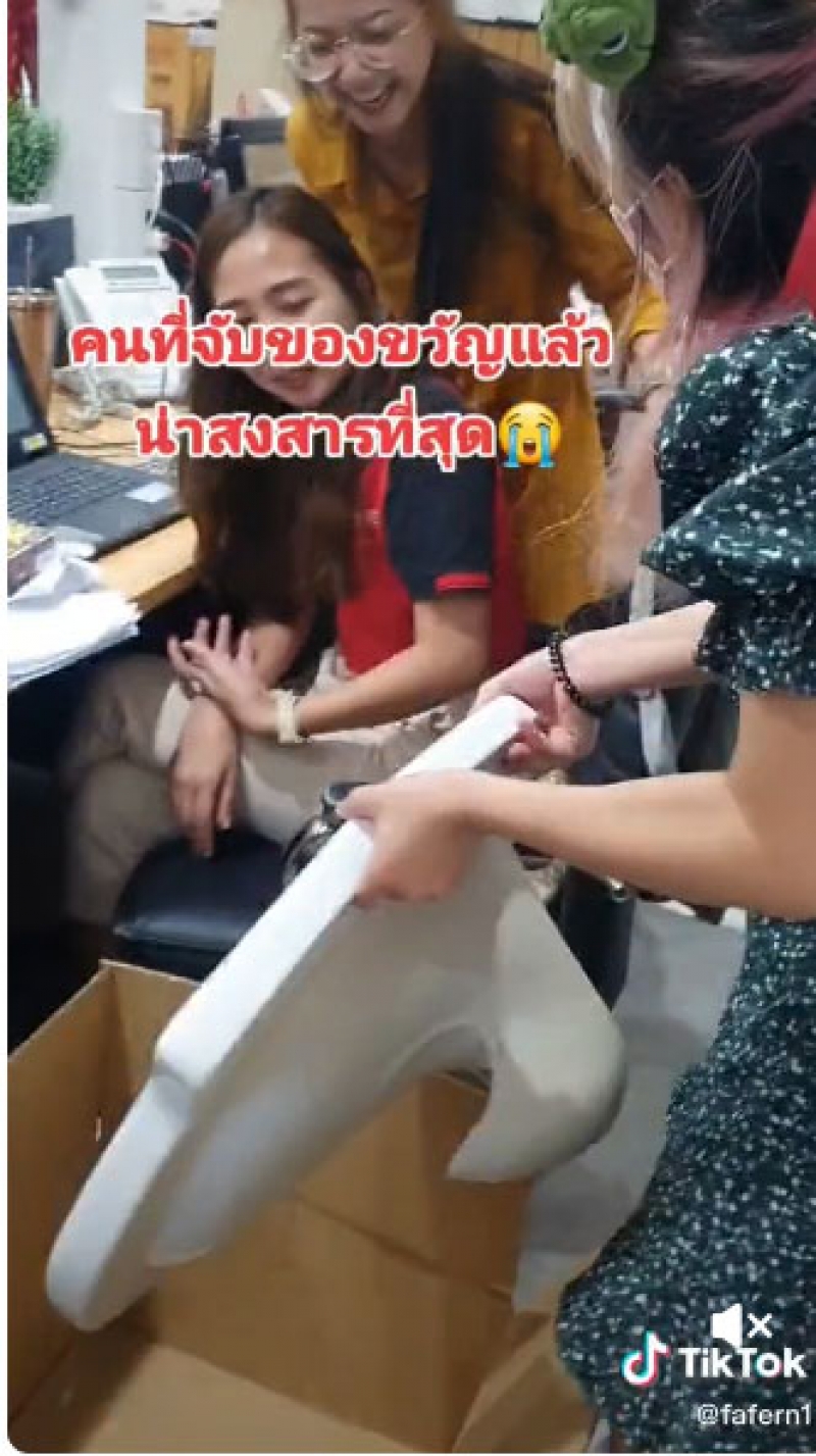 เธอนั้นเอามือจับหัวทันที เพราะของที่เห็นนั้นมันคือ โถส้วมแบบนั่งยอง และไม่รู้จะเอาไปทำอะไร ซึ่งในคลิปได้มีการเขียนด้วยว่า คนที่จับของขวัญแล้วน่าสงสารที่สุด