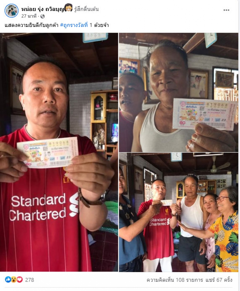 ล่าสุดพบคนถูกรางวัลที่ 1 โดยผู้ใช้เฟสบุ๊คชื่อ หน่อย รุ่ง ถวิลบุญ ได้ออกมาโพสต์ภาพ พร้อมระบุข้อความว่า แสดงความยินดีกับลูกค้า #ถูกรางวัลที่ 1 ด้วยจ้า