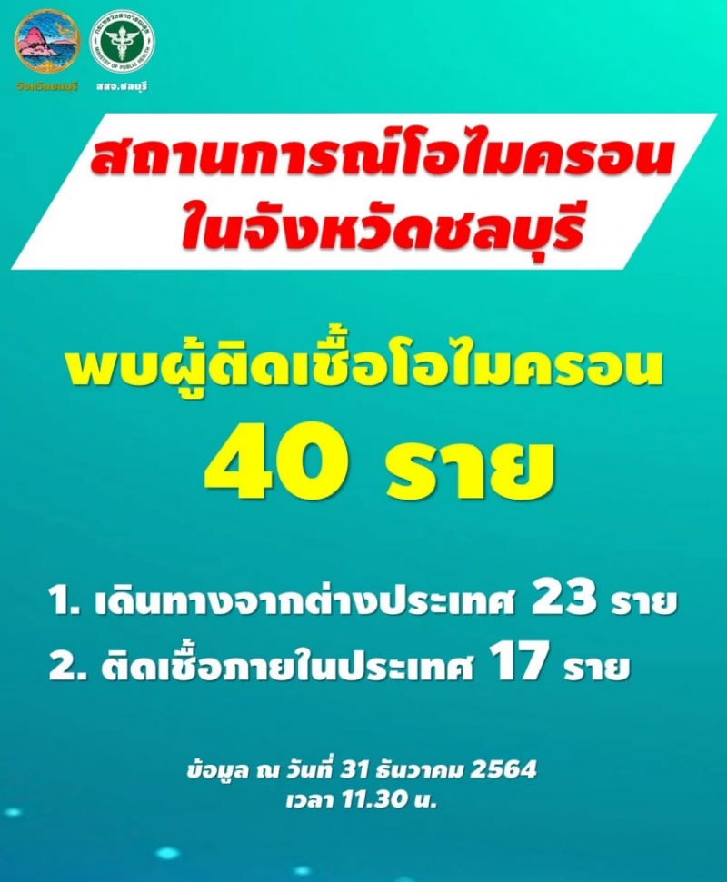 วันที่ 31 ธ.ค.64 สำนักงานสาธารณสุขจังหวัดชลบุรี สสจ.ชลบุรี ขณะนี้มีผู้ติดcv สายพันธุ์โอไมครอน จังหวัดชลบุรี 40 ราย