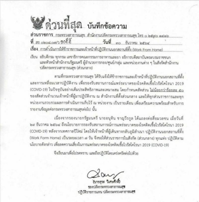 สธ.มีหนังสื่อด่วน สั่งเวิร์กฟรอมโฮม 7 วัน หลังปีใหม่