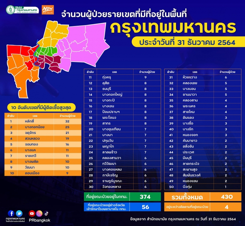 ประจำวันที่ 31 ธันวาคม 2564 รวม 50 เขต ที่อยู่ขณะติดอยู่ใน กทม. 374 ราย ที่อยู่ขณะติดอยู่ต่างจังหวัดเข้ารักษารพ. ใน กทม. 56 ราย