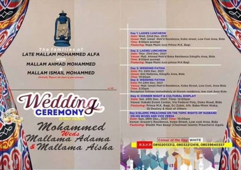 จากรายงานระบุว่า เจ้าบ่าวนั้นคือ โมฮัมหมัด จากรัฐเบนเว ของไนจีเรีย ส่วนเจ้าสาวของเขาคือ อดามา และ ไอซา โดยทั้ง 3 คนจะจัดงานฉลองสมรสกันที่เมืองบิดา รัฐไนเจอร์ เริ่มตั้งแต่วันที่ 22 ธันวาคม ไปจนถึงวันที่ 26 ธันวาคม