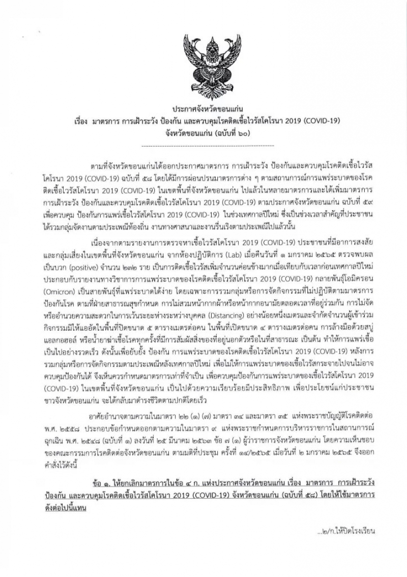 เมื่อวันที่ 2 ม.ค. 65 ที่ผ่านมา นายสมศักดิ์ จังตระกุล ผู้ว่าราชการจังหวัดขอนแก่น ในฐานะประธานกรรมการติดต่อจังหวัดขอนแก่น ผู้อำนวยการศูนย์บริหารราชการในสถานการณ์ฉุกเฉินจังหวัดขอนแก่น ลงนามในประกาศจังหวัดขอนแก่น เรื่อง มาตรการ การเฝ้าระวัง ป้องกัน และควบคุมติดต่อจังหวัดขอนแก่น (ฉบับที่ 60)