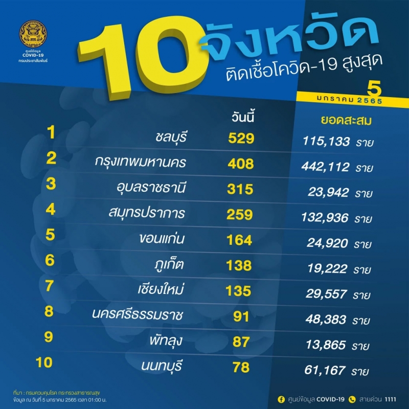 จํานวนผู้ติดcvในประเทศรายใหม่ วันที่ 5 มกราคม 2565 ตรวจสอบ 10 จังหวัดอันดับ